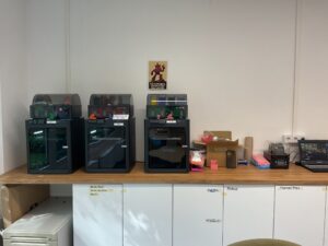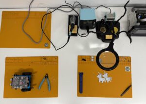 Die 3D-Drucker stehen selten still, es werden 3D-Modelle entworfen, es wird gelötet, Roboter werden zum Leben erweckt und mit der Stickmaschine werden Textilien verschönert. Noch steht unsere CNC-Fräse still, aber in Kürze soll auch sie eine weiterere Möglichkeit für die Erschaffung von schönen Dingen werden.